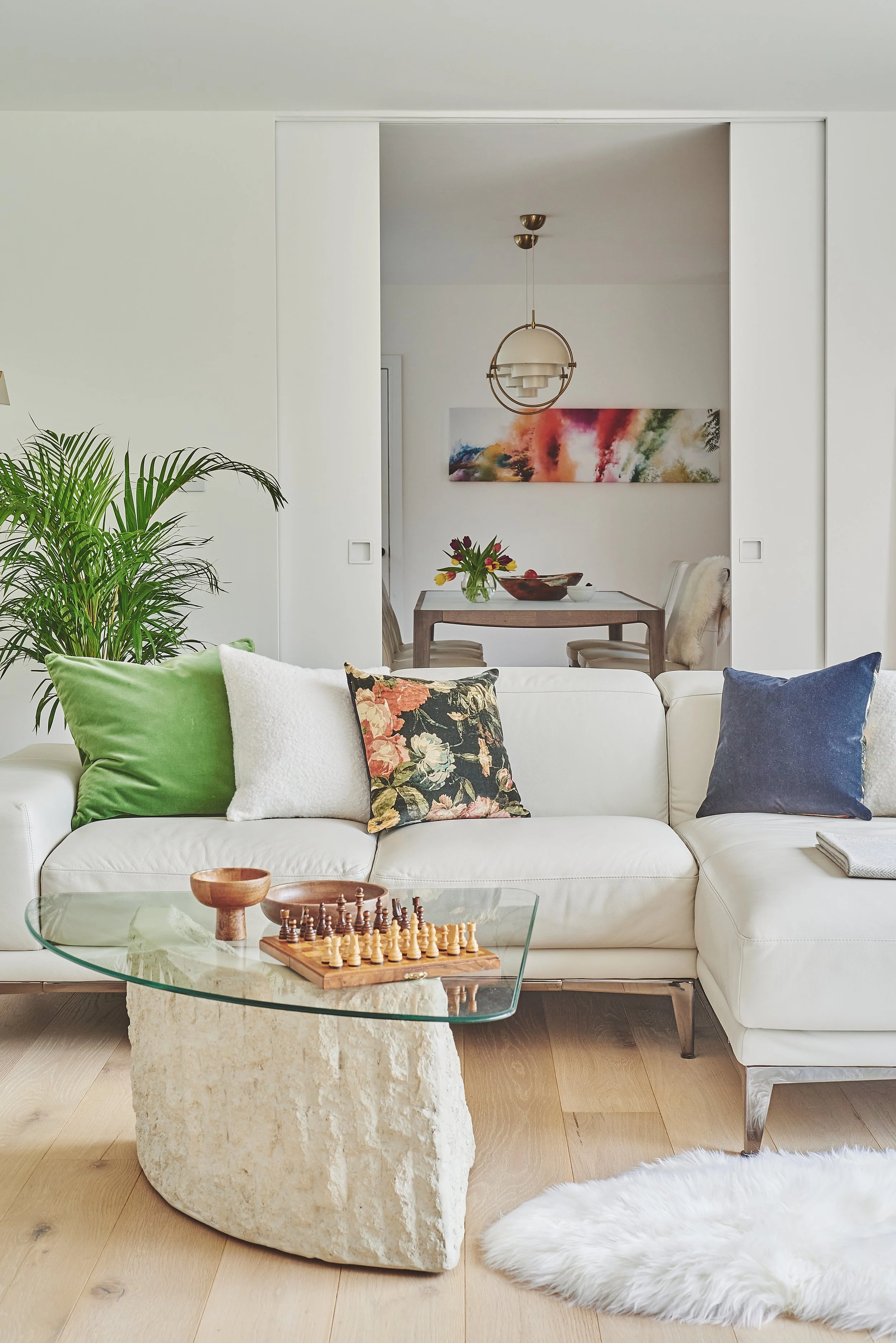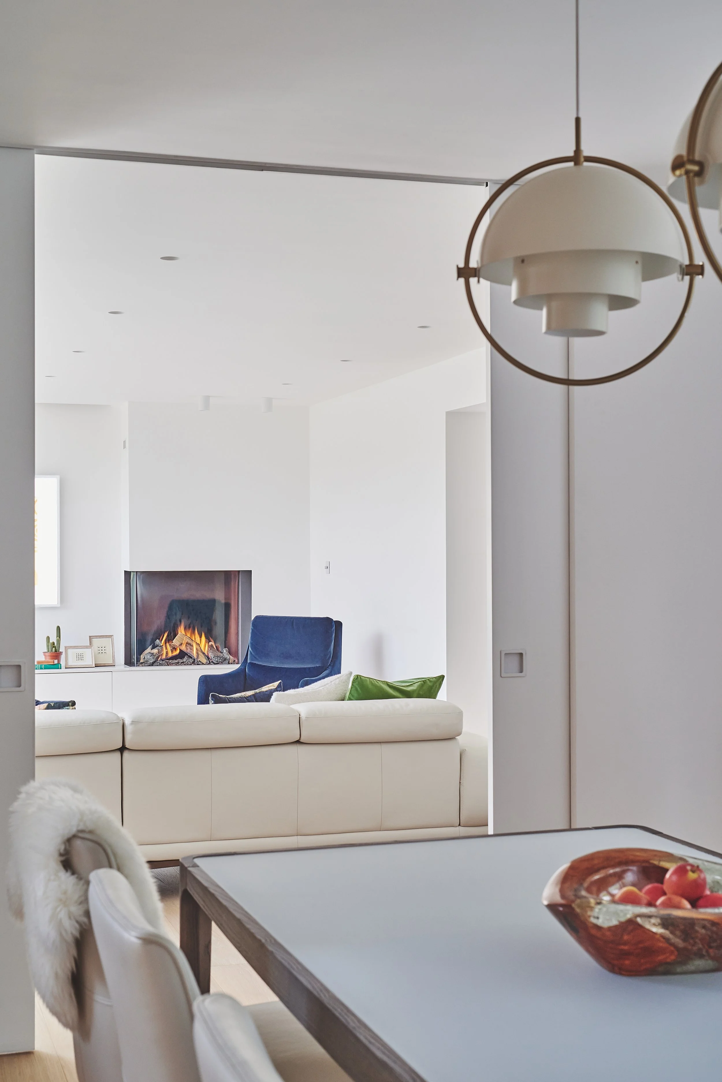 To anchor the room, a redundant window was closed to create a strong focal point for the TV and fireplace wall. New triple-panel floor-to-ceiling sliding doors opened the lounge onto the garden. Double pocket doors were introduced between the lounge and dining room, allowing the spaces to be connected or separated seamlessly.