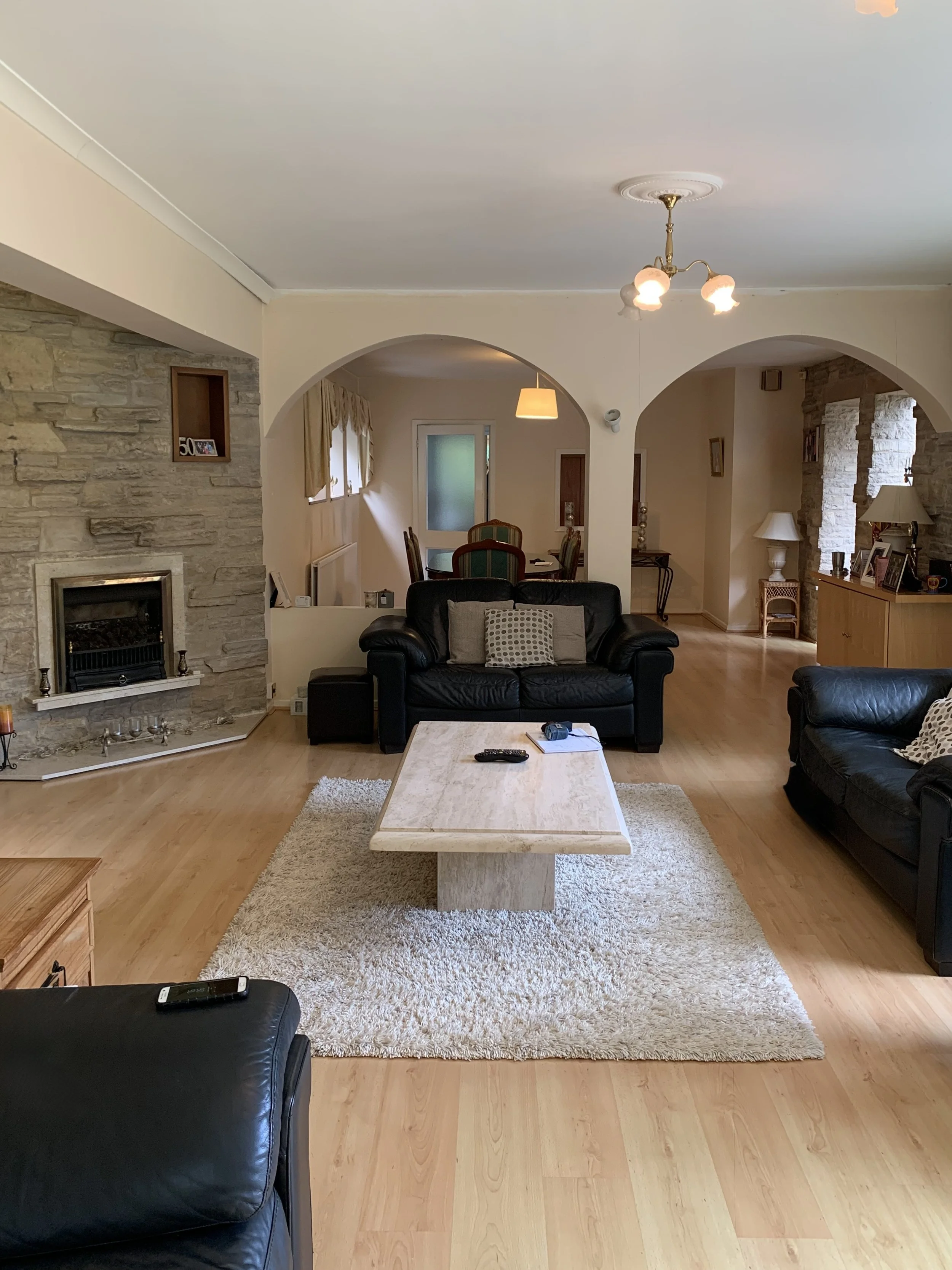 This 1950s detached home featured striking modernist elements—concrete structure, stone cladding and over 50sqm of open-plan space—but the lounge and dining areas felt dated, unstructured and lacking cohesion. With multiple doorways and windows, there was no clear focal point or sense of flow.